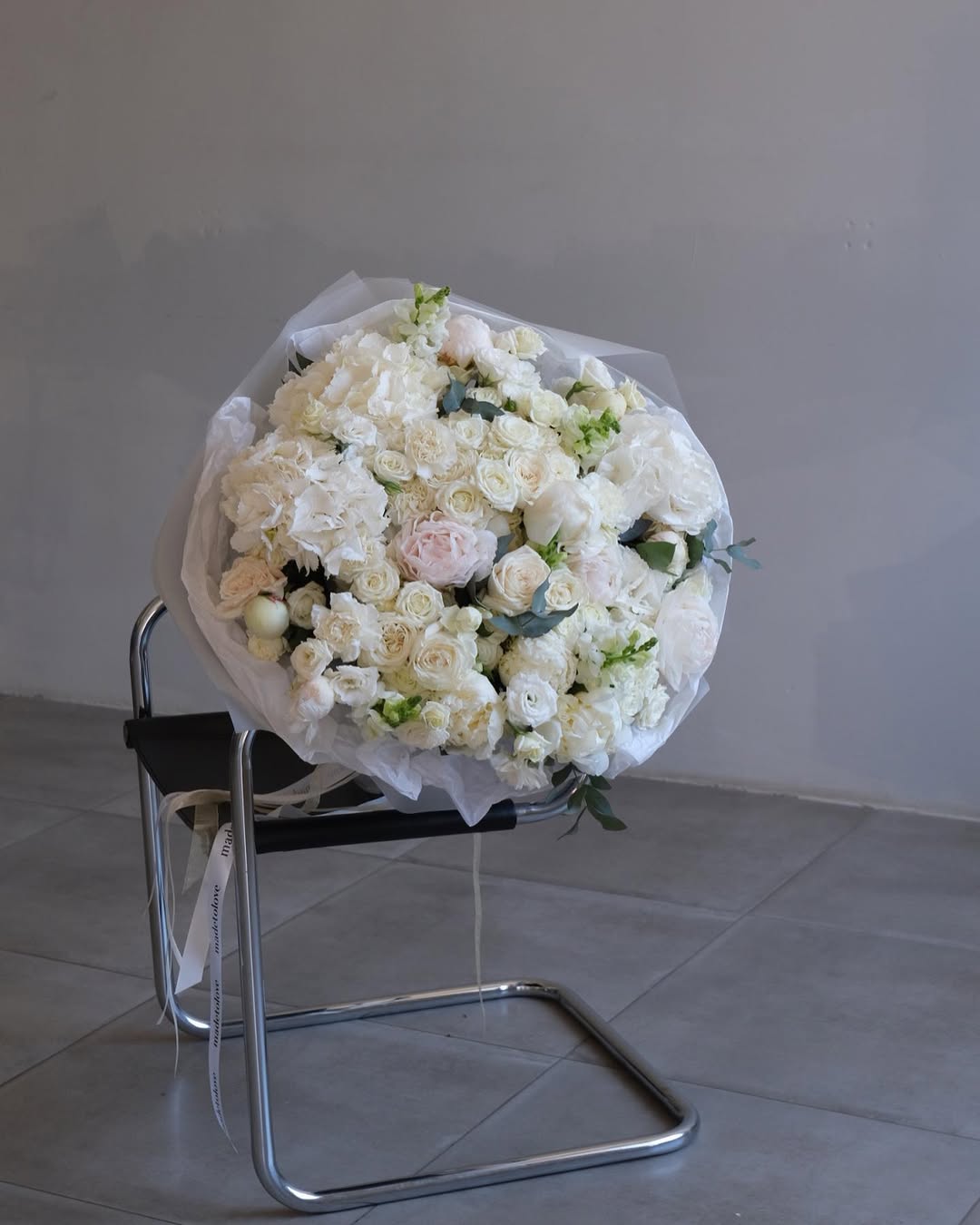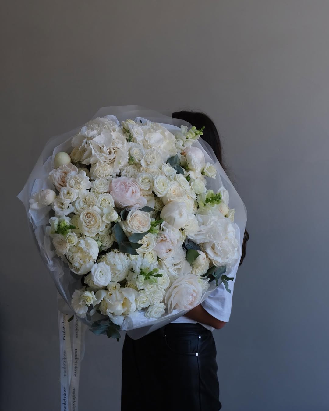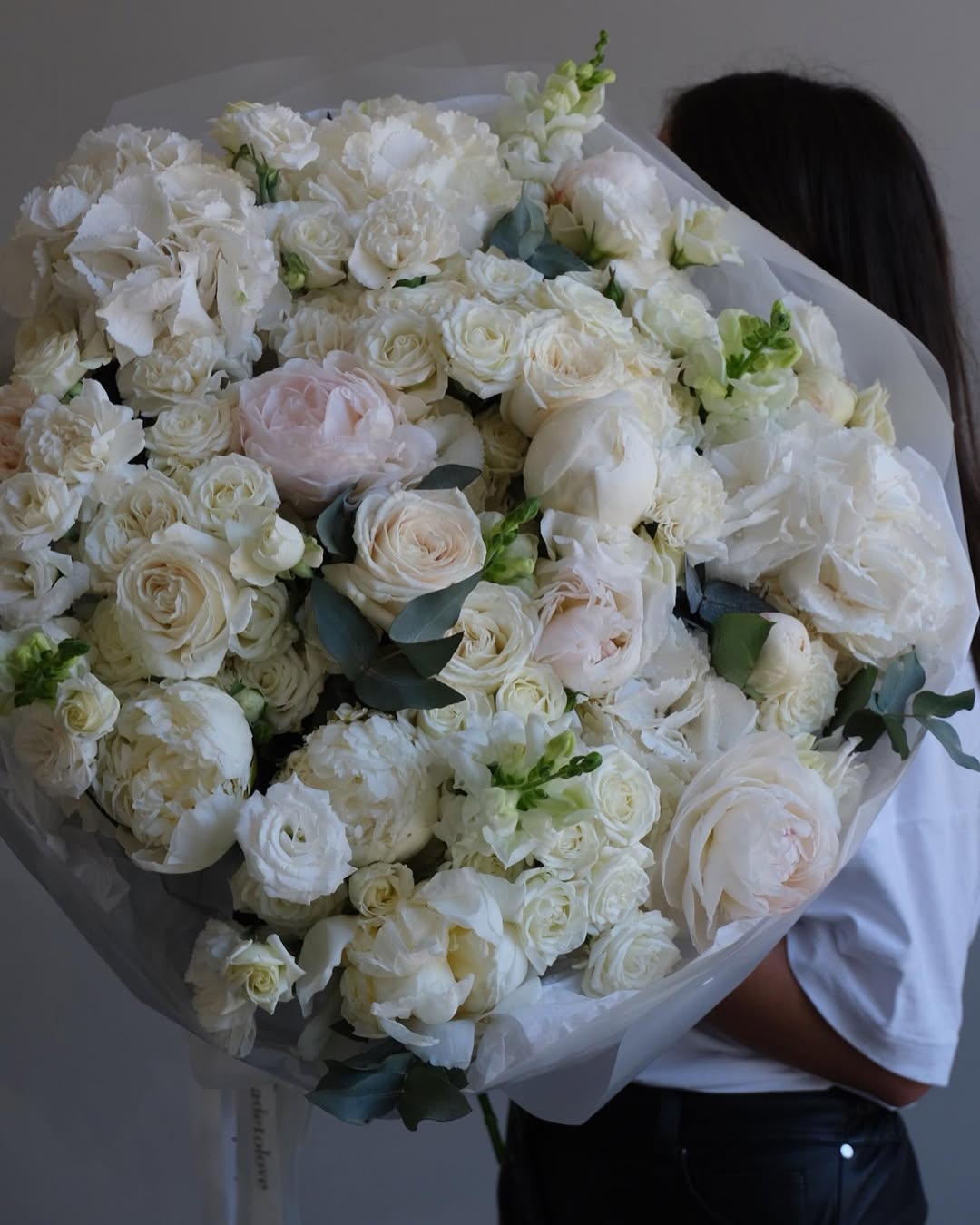 An oversized bouquet of soft white florals.